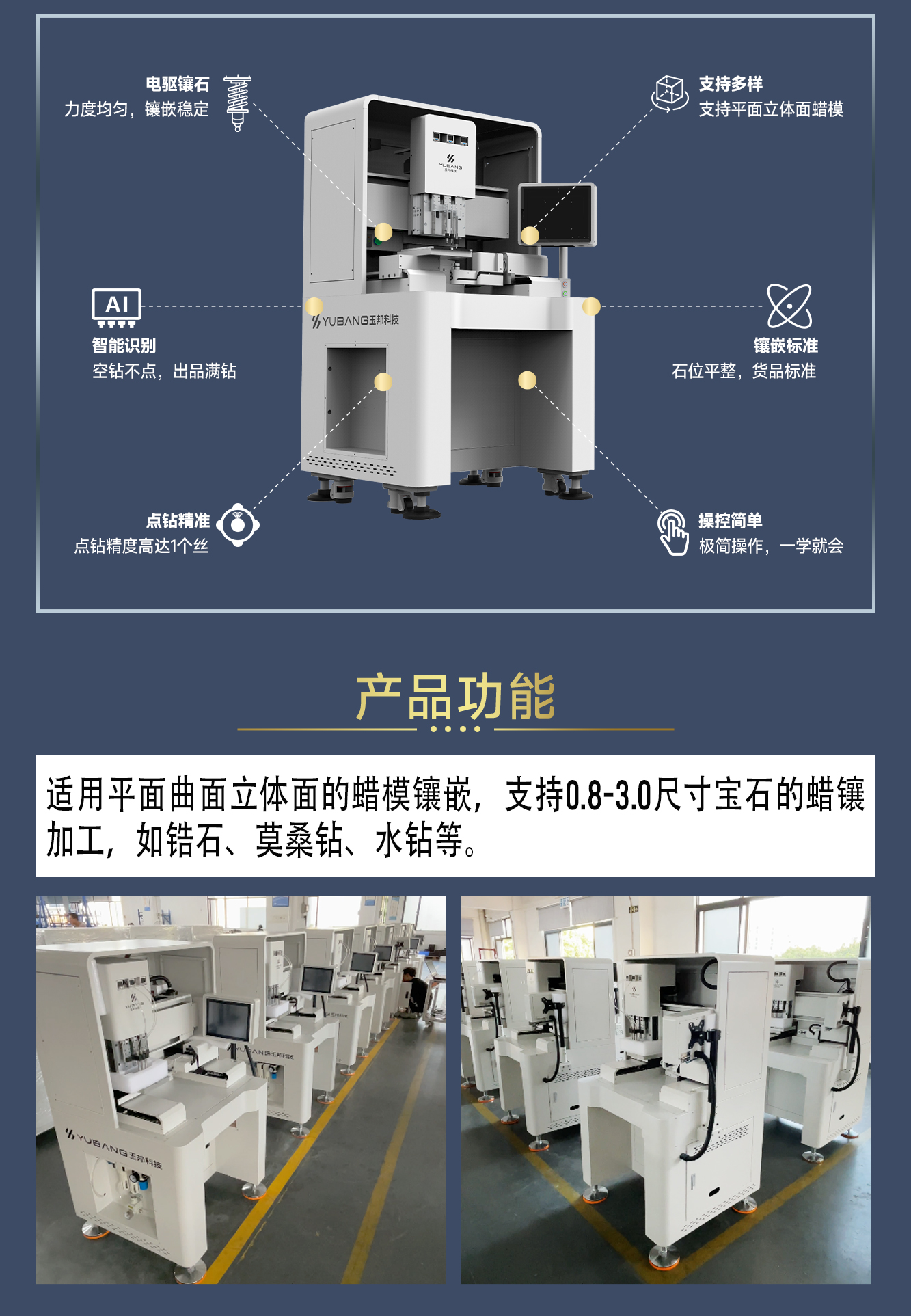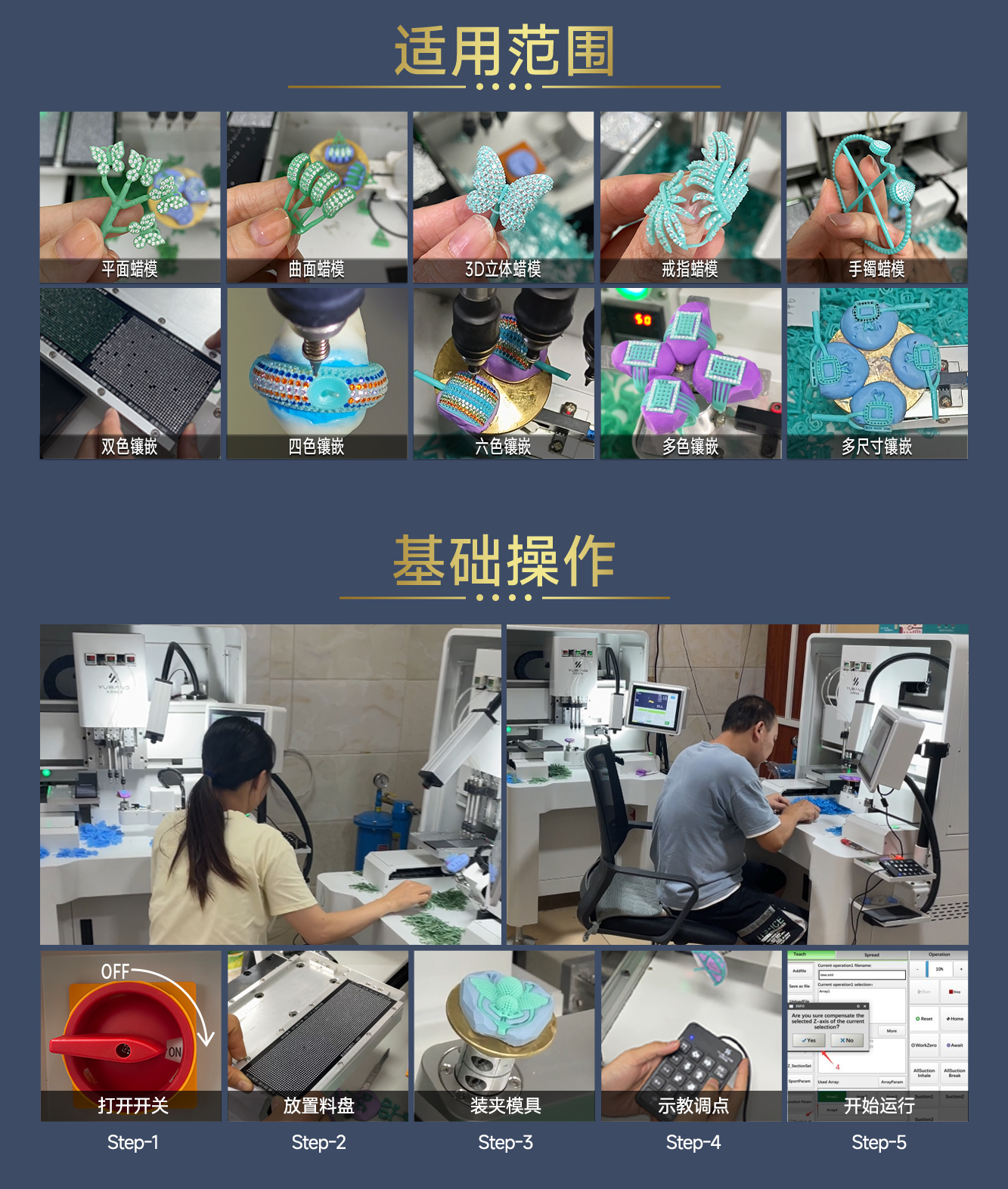 采用五轴高配置,支持0.8-3.0mm锆石、莫桑钻、水钻等多种材质,轻松应对平面、曲面及立体蜡模加工,适配90%以上款式需求;满足多样化加工场景,可实现不同颜色、不同尺寸宝石同步镶嵌。基于电驱式镶石原理,力度均匀稳定,配合设备内置的精密控制系统,确保点钻精度高,成品品质一致,持续24小时运行不偏位。操作简便快捷,学习门槛低,零基础用户也能快速上手。