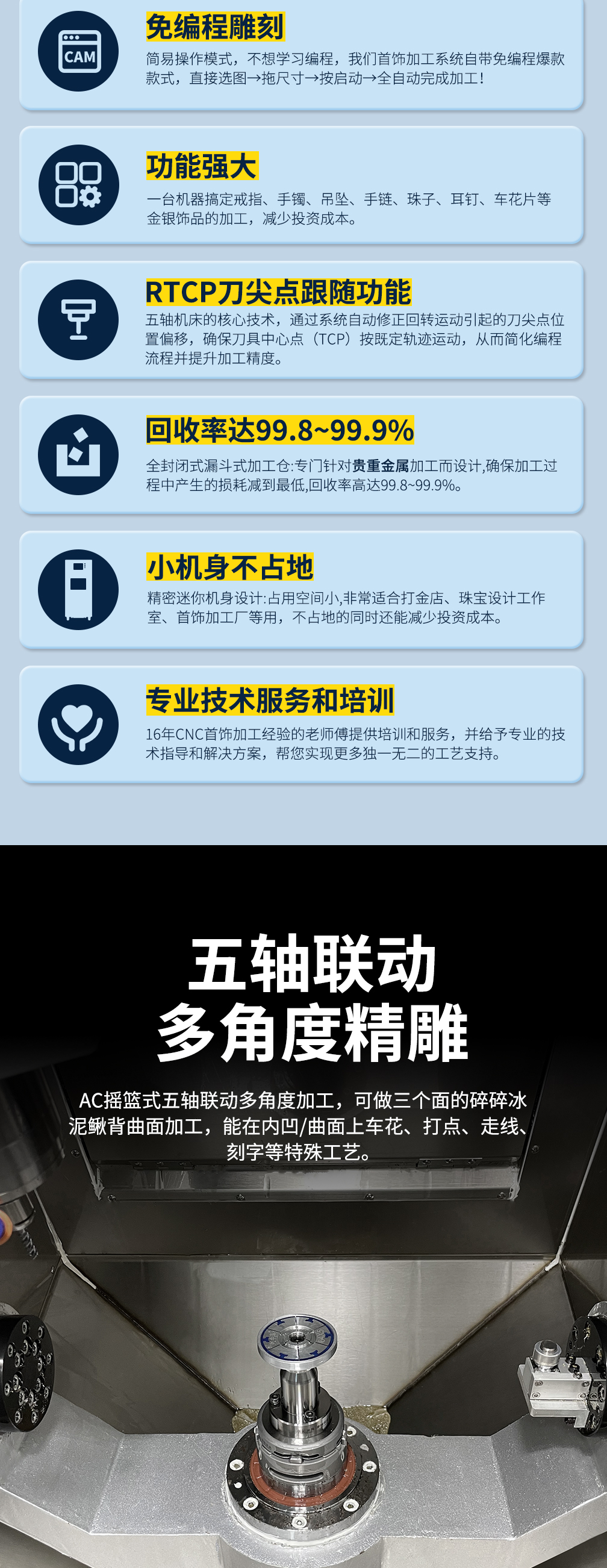 五轴 CNC 金银首饰精雕机,立体精密雕刻专用设备!360° 全方位雕刻无盲区,精度高造型准,适配高端首饰定制。