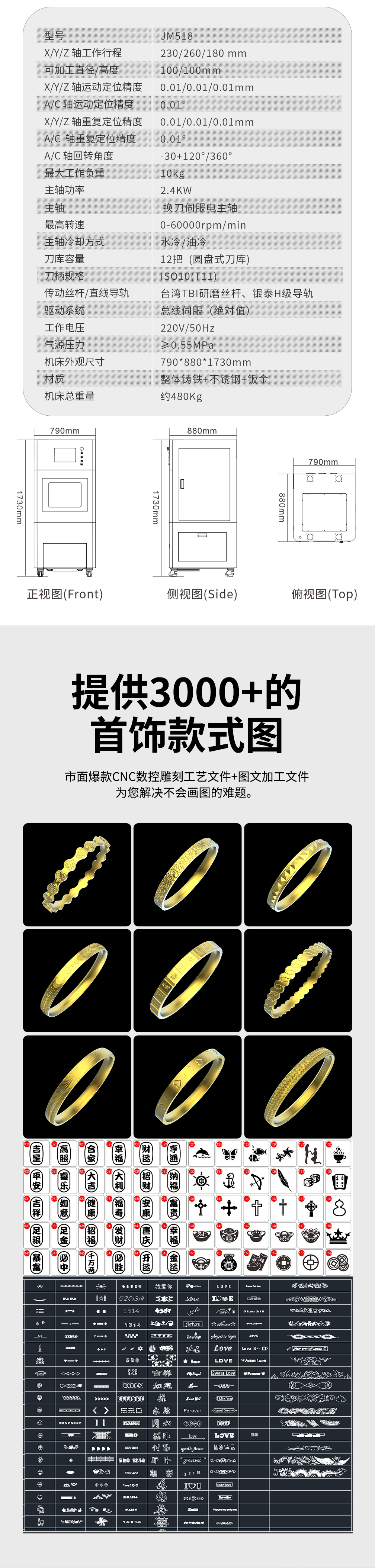 这款五轴CNC金银首饰精雕机专为高精度立体雕刻设计,适用于各类金银首饰的精细加工。设备支持360°全方位雕刻,确保无盲区、无死角,能够精准还原复杂的雕刻设计。