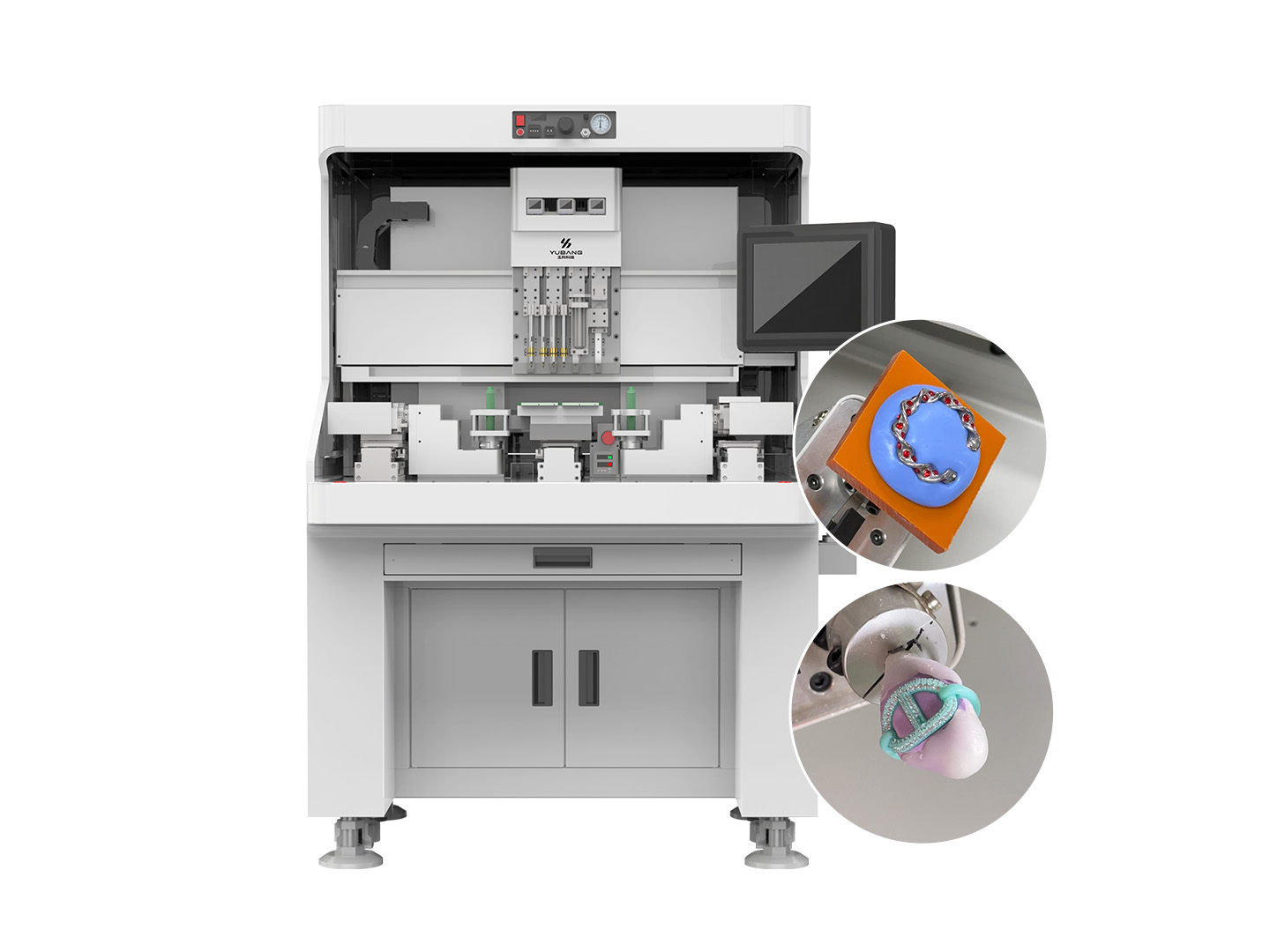 点胶点钻一体机,双工位设计支持不停机操作,一人即可完成点钻查货,效率高、良品率优。采用电驱动系统,出胶稳定、点钻精准,适用于首饰、五金、工艺品等多类产品的点钻工艺。可同时处理多种颜色和尺寸的钻,支持分款式及复杂立体款式加工,配备工业级五轴控制器,兼容蜡镶工艺,满足多样化生产需求。